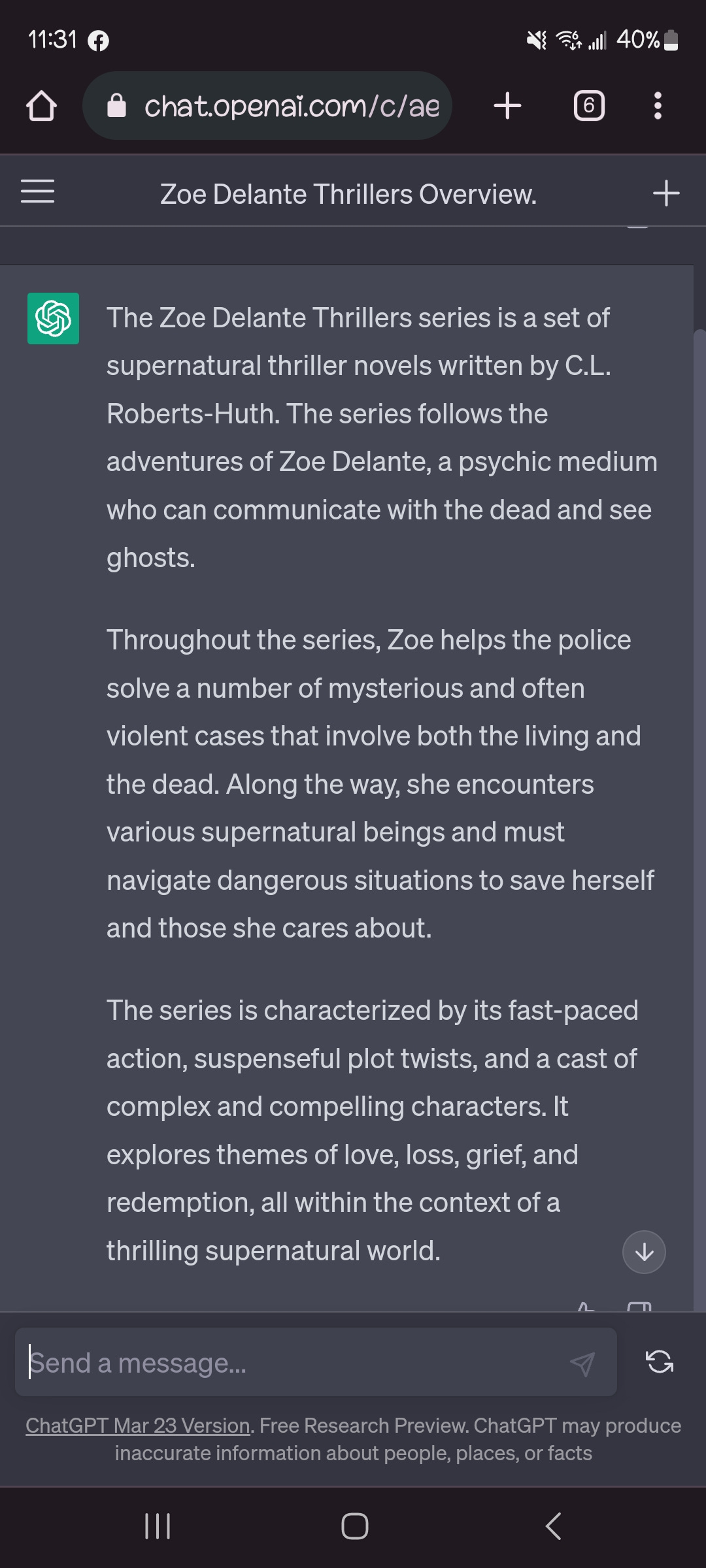 So, after I saw my author friend, Leslea Tash post her results from ChatGPT, I thought I would give it a go! While my bio was horrifically wrong, I absolutely loved the overall blurb for my Zoe Delante Thriller Series: